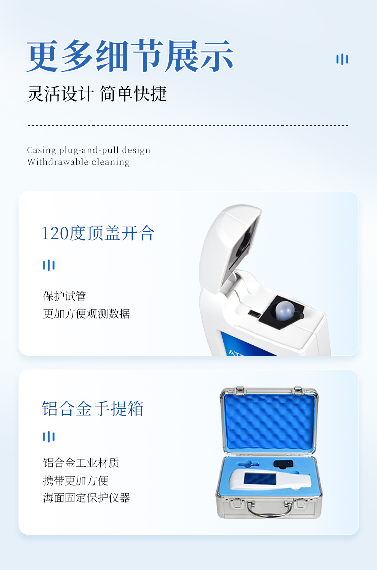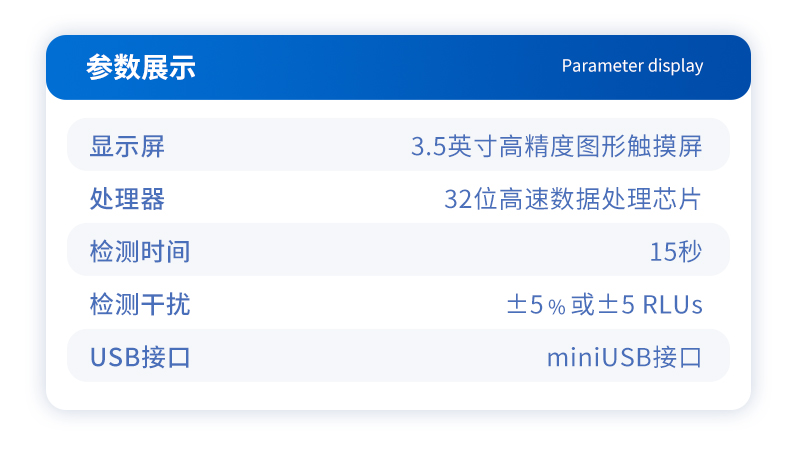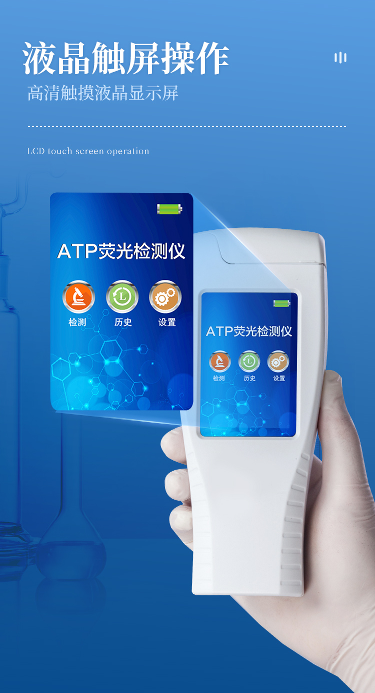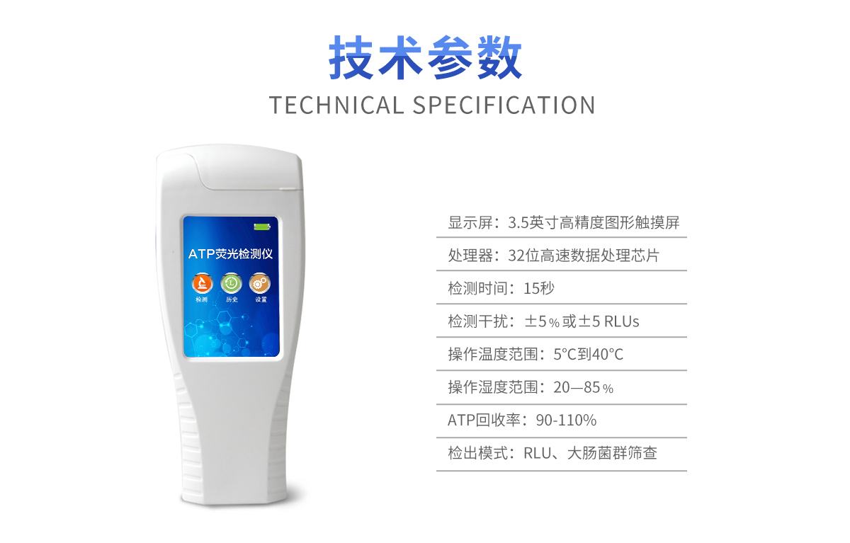 該設(shè)備采用生物化學(xué)反應(yīng)方法檢測(cè)ATP含量,細(xì)菌檢測(cè)儀基于螢火蟲發(fā)光原理,利用“熒光素酶—熒光素體系”快速檢測(cè)三磷酸腺苷(ATP)。ATP拭子含有可以裂解細(xì)胞膜的試劑,能將細(xì)胞內(nèi)ATP釋放出來,與試劑中含有的特異性酶發(fā)生反應(yīng),產(chǎn)生光,再用熒光照度計(jì)檢測(cè)發(fā)光值,微生物的數(shù)量與發(fā)光值成正比,由于所有生物活細(xì)胞中含有恒量的ATP,所以ATP含量可以清晰地表明樣品中微生物與其他生物殘余的多少,用于判斷衛(wèi)生狀況。