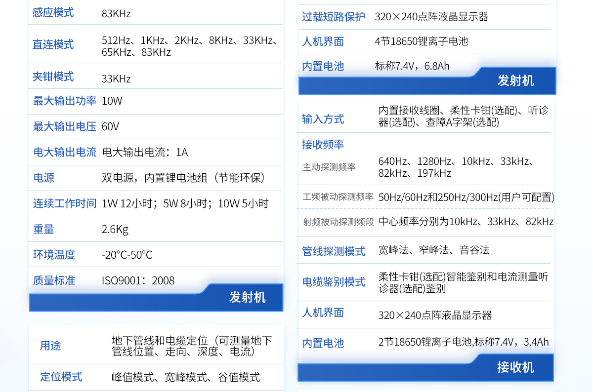 | 1、采用DSP處理器,運算速度快,精度更高; | 2、帶有導向功能指標管線走向,定位更快; | 3、采用10W寬頻發射機,適應各種環境的探測; | 4、接收機和發射機都采用鋰電池組供電,節能環保,每年可節省3000-5000元的電池費用。 |