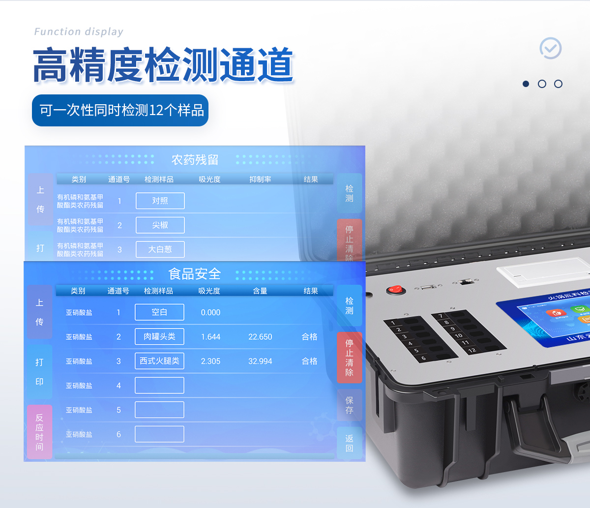 5、一體化便攜式快檢設(shè)備,滿足現(xiàn)場及流動檢測使用需求,能夠在同一軟件下實現(xiàn)所有檢測項目的檢測,并可通過同一窗口直觀顯示檢測結(jié)果。