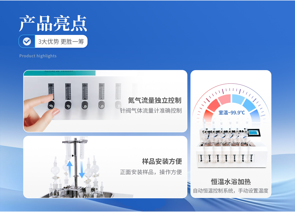 1.大容量反應瓶,可同時處理多個樣品。 2.恒溫水浴加熱,具有快速自動恒溫控制系統,加熱溫度可以手動設定。 3.每個樣品的氮氣流量獨立控制調節或關閉,針閥氣體流量計準確控制和顯示氣體總消耗量。 4.由升降位置固定旋鈕調節樣品架及配氣系統,旋轉樣品架的升降,正面安裝樣品,操作方便。 5.鹽酸口、氣體進氣口、出口三口一體且相互區分開,不干擾操作。