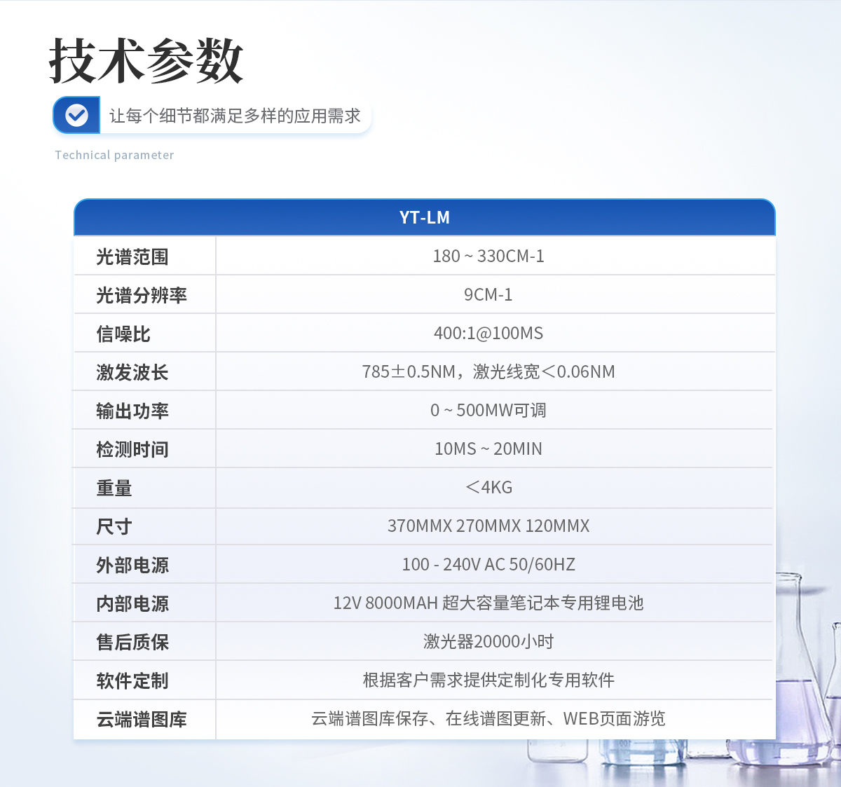 規(guī)格:YT-LM標(biāo)準(zhǔn)版 光譜范圍:180 ~ 3300cm-1 光譜分辨率:9cm-1 信噪比:400:1@100ms 激發(fā)波長(zhǎng):785+0.5nm,激光線寬< 0.06 nm 輸出功率:0~ 500mW可調(diào) 檢測(cè)時(shí)間:10ms ~ 20min 重量:<4kg 尺寸:370mmx 270mmx 120mm 外部電源:100-240V AC 50/60Hz 內(nèi)部電源:12V 8000mAH 超大容量筆記本專用鋰電池 售后質(zhì)保:激光器20000小時(shí) 軟件定制:根據(jù)客戶需求提供定制化專用軟件 云端譜圖庫:支持云端譜圖保存、 在線譜圖更新、WEB 頁面瀏覽