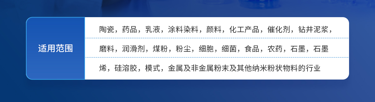 陶瓷,藥品,乳液,涂料染料,顏料,化工產品,催化劑,鉆井泥漿,磨料,潤滑劑,煤粉,粉塵,細胞,細菌,食品,農藥,石墨,石墨烯,硅溶膠,模式,金屬及非金屬粉末及其他納米粉狀物料的行業。