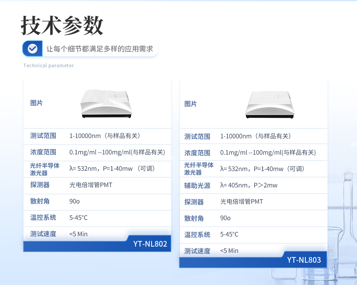 | 規格型號:YT-NL802 | 執行標準:GB/T 19627-2005/ISO 13321-1996 GB/T 29022-2012/ISO 22412-2008 | 測試范圍 :1-10000nm(與樣品有關) | 濃度范圍:0.1mg/ml--100mg/ml(與樣品有關) | 準確度誤差:<1%(國家標準樣品d50值)> | 重復性誤差:<1%(國家標準樣品d50值)> | 激光光源:光纖半導體激光器,λ= 532nm,P=1-40mw (可調) | 探測器:光電倍增管PMT | 散射角:90o | 樣品池體積:10mm*10mm*40mm, 1--4mL | 溫控范圍:5-45℃ | 溫控精度:0.1℃ | 測試速度:<5 min=""> | 數字相關器主要參數: (1)規格型號 CR256 (2)自相關通道 256 (3)基線通道 4 (4)物理通道數 5000 (5)延遲時間 100ns-10ms(可調) | 體積:480mm*270mm*170mm | 重量:12Kg |