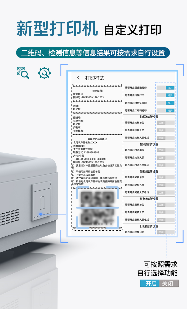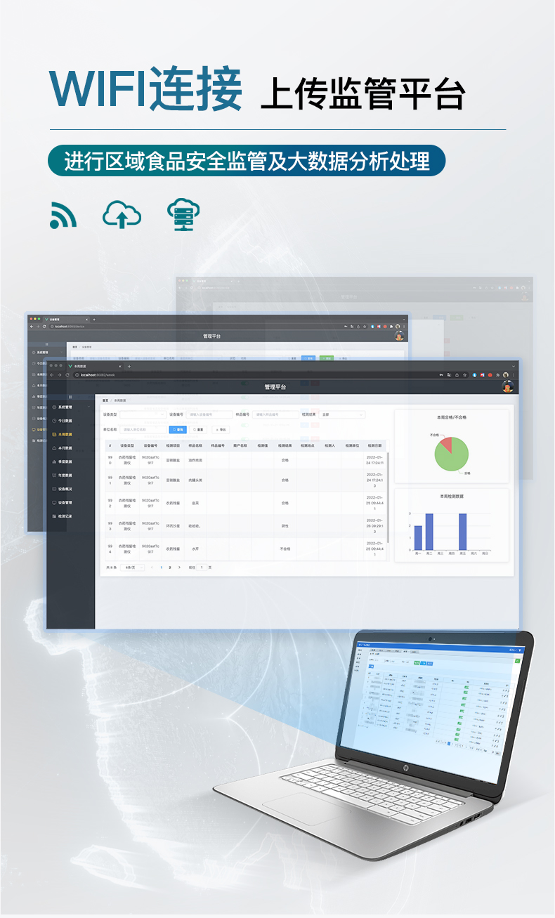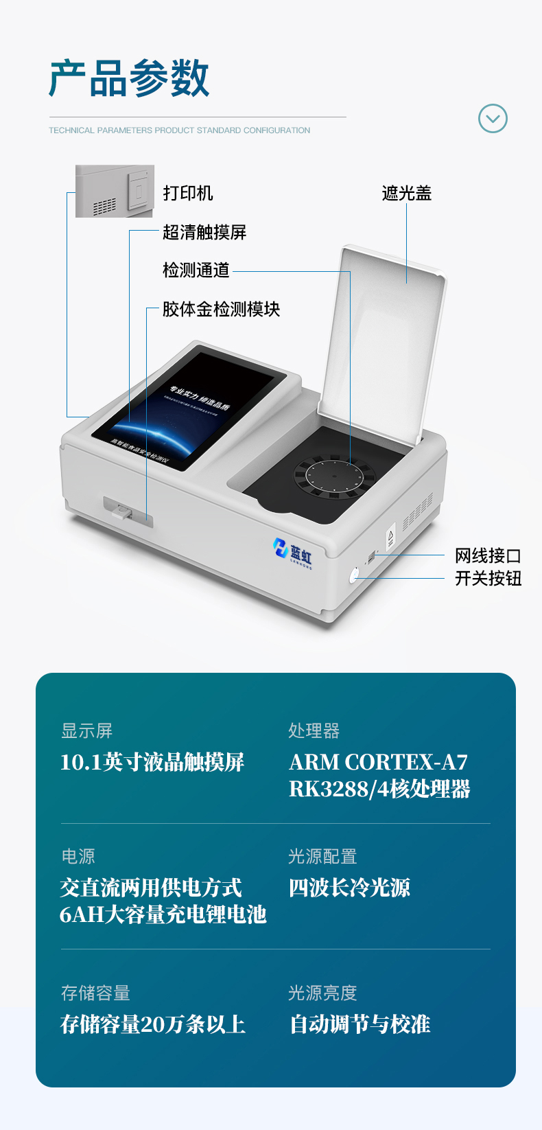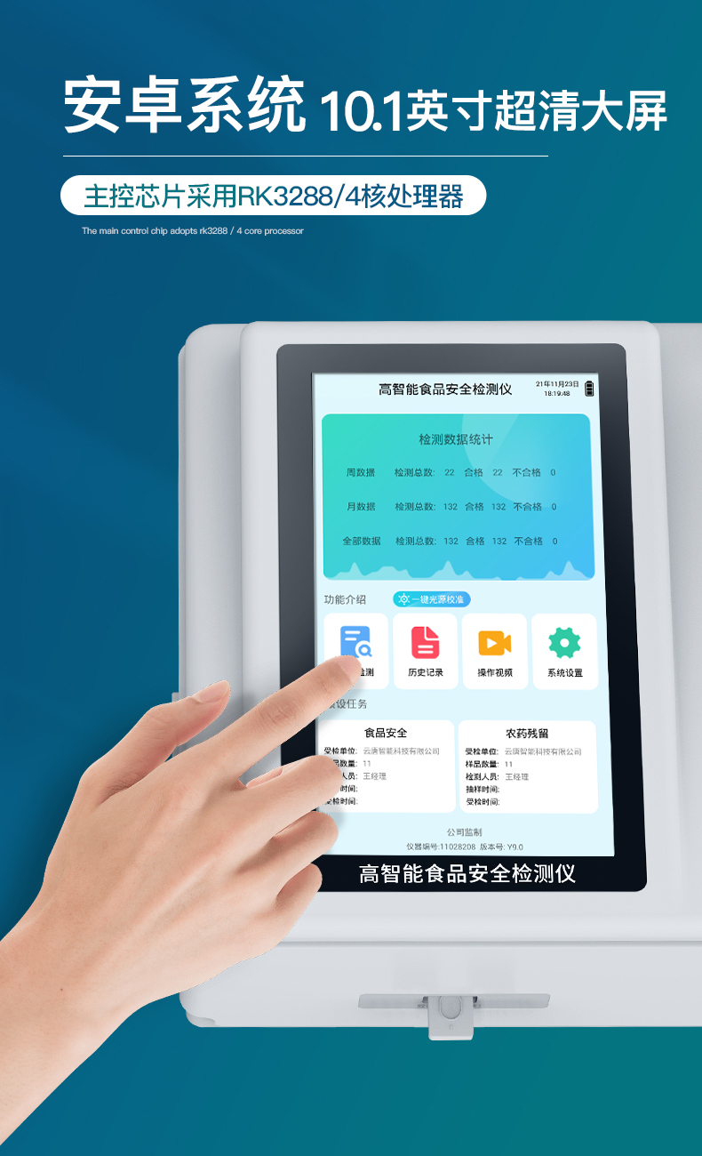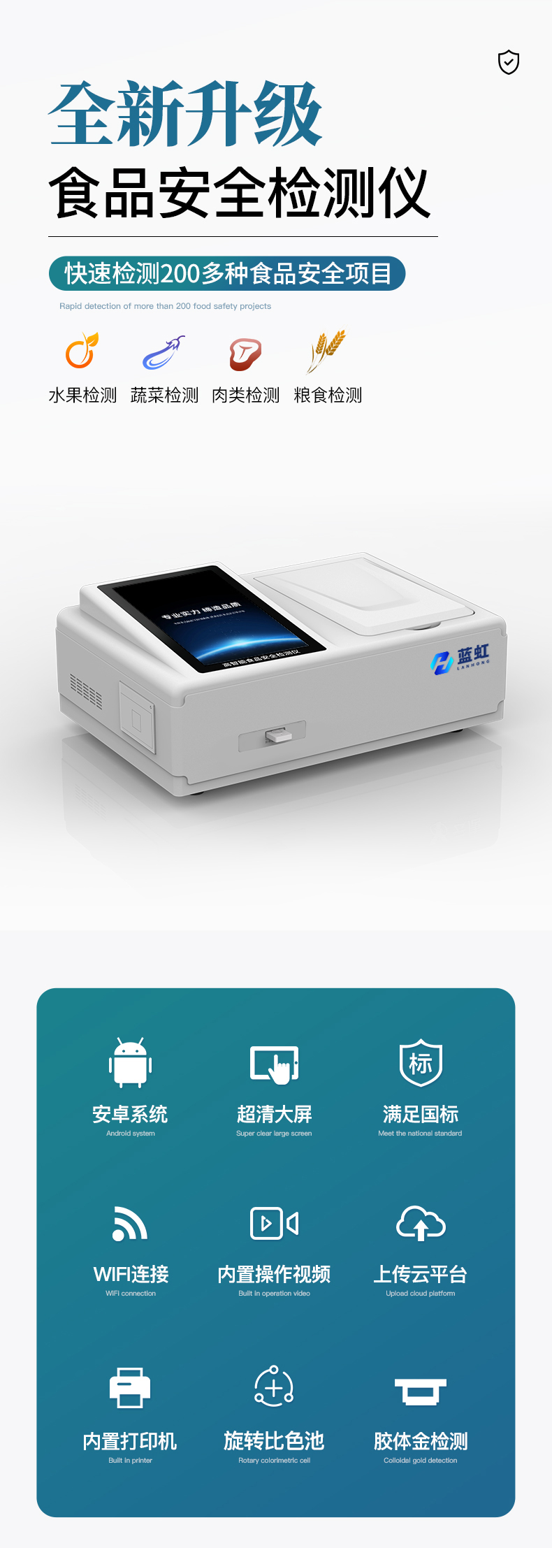 | 儀器采用手提式一體化系統(tǒng)檢測(cè)技術(shù),將分光光度模塊、數(shù)字化管理模塊、無(wú)線通訊模塊高度集成于一體,支持檢測(cè)200種食品安全檢測(cè)項(xiàng)目,同時(shí)預(yù)留升級(jí)檢測(cè)方法。 | 儀器檢測(cè)模塊標(biāo)準(zhǔn)化、智能化,檢測(cè)項(xiàng)目可隨意自由組合。檢測(cè)箱體內(nèi)置多個(gè)標(biāo)準(zhǔn)檢測(cè)單元,檢測(cè)模塊可以調(diào)整配置。 | 顯示屏幕:儀器采用10.1英寸豎向液晶觸摸屏顯,搭配運(yùn)行安卓智能操作系統(tǒng),主控芯片采用ARM Cortex-A7,RK3288/4核處理器,主頻1.88Ghz,操作方便,性能更強(qiáng)。 | 檢測(cè)通道:≥12通道;采用精密旋轉(zhuǎn)比色池設(shè)計(jì),使用同芯片同光源校準(zhǔn)精度,解決不同光源之間的誤差值,更加準(zhǔn)確**。(1-12通道間誤差0.1%,***:**202022821055.2) | 儀器光源:高精度進(jìn)口四波長(zhǎng)冷光源,每個(gè)通道均配置 410、520、590、630nm 波長(zhǎng)光源,標(biāo)配**的光路切換裝置,專利光路切換功能可實(shí)現(xiàn)64波長(zhǎng),并且所有檢測(cè)項(xiàng)目可實(shí)現(xiàn)所有通道同時(shí)檢測(cè)。 | 設(shè)備可一鍵校準(zhǔn),自動(dòng)保存校準(zhǔn)數(shù)據(jù),自動(dòng)對(duì)比校驗(yàn),得到精準(zhǔn)光源,采用Android SP存儲(chǔ)數(shù)據(jù),光源數(shù)據(jù)永不丟失,方便每一次使用。 | 通訊接口:配備無(wú)線通信模塊、可選配4G(APN)通訊模塊和藍(lán)牙傳輸,同時(shí)具有雙USB接口以及RJ45網(wǎng)線接口,可以多方式實(shí)現(xiàn)數(shù)據(jù)保存及數(shù)據(jù)傳輸。 | 存儲(chǔ)方式:支持U盤存儲(chǔ),標(biāo)準(zhǔn)USB接口,免驅(qū)動(dòng)安裝。檢測(cè)結(jié)果存儲(chǔ)容量20萬(wàn)條以上,可生成Excel表格進(jìn)行拷貝,并具有登錄保護(hù)功能。 | 智能化操作系統(tǒng): | 1)操作系統(tǒng):儀器可在同一檢測(cè)界面自動(dòng)對(duì)應(yīng)相關(guān)檢測(cè)通道,一次性選擇1-12個(gè)樣品名稱,無(wú)需退出界面,節(jié)省操作時(shí)間。并可以對(duì)每個(gè)通道屬性和樣品信息單獨(dú)進(jìn)行編輯,例如送檢單位、人員,檢測(cè)人員等,打印時(shí)勾選打印顯示。 | 2)數(shù)據(jù)集成系統(tǒng):設(shè)備首頁(yè)自動(dòng)匯總分析檢測(cè)數(shù)據(jù),包含:周檢測(cè)數(shù)據(jù)、月檢測(cè)數(shù)據(jù),全部檢測(cè)總數(shù)量,均包含檢測(cè)總數(shù),合格數(shù),不合格數(shù),以及相關(guān)柱形分析圖,各項(xiàng)檢測(cè)數(shù)據(jù)一目了然,無(wú)需電腦查詢,更加快捷直觀。 | 3)數(shù)據(jù)庫(kù)系統(tǒng):十幾項(xiàng)數(shù)據(jù)庫(kù)分類管理儀器:包含項(xiàng)目類型、項(xiàng)目數(shù)據(jù)、檢測(cè)數(shù)據(jù)、歷史記錄、國(guó)標(biāo)信息、曲線信息、采樣信息、檢測(cè)信息、受檢信息、復(fù)核信息、圖表信息、光源校準(zhǔn)信息、打印樣式信息、樣品庫(kù)信息等等,數(shù)據(jù)庫(kù)之間互相協(xié)調(diào)聯(lián)動(dòng)保證數(shù)據(jù)的真實(shí)完整性。同時(shí)產(chǎn)品數(shù)據(jù)庫(kù)以及歷史檢測(cè)記錄支持一鍵檢索功能。 | 4)限量規(guī)判系統(tǒng):具有限量查詢、添加物質(zhì)合規(guī)判定系統(tǒng)。檢測(cè)出結(jié)果后,系統(tǒng)自動(dòng)調(diào)用系統(tǒng)數(shù)據(jù)庫(kù)中相關(guān)國(guó)標(biāo)進(jìn)行比對(duì)判定,客觀顯示判定結(jié)果是否合格。 | 5)項(xiàng)目預(yù)設(shè)系統(tǒng):儀器具有任務(wù)預(yù)設(shè)模塊,一鍵提前預(yù)設(shè),給出方便快捷的新檢測(cè)方案,每一個(gè)任務(wù)分別可以設(shè)置不同的樣品、批次、編號(hào)、來源、備注、抽樣信息、檢測(cè)信息、受檢信息、復(fù)核信息等更多信息。樣品送檢時(shí)一鍵調(diào)取保存信息,并可多次調(diào)取,大大提高檢測(cè)效率。 | 6)數(shù)據(jù)監(jiān)管系統(tǒng):同步對(duì)接監(jiān)管平臺(tái),數(shù)據(jù)可局域網(wǎng)和互聯(lián)網(wǎng)數(shù)據(jù)上傳,檢測(cè)結(jié)果可選擇直接傳至食品安全監(jiān)管平臺(tái)。進(jìn)行區(qū)域食品安全監(jiān)管及大數(shù)據(jù)分析處理與數(shù)據(jù)統(tǒng)計(jì),檢測(cè)區(qū)域食品安全長(zhǎng)短期動(dòng)態(tài),達(dá)到食品安全問題預(yù)估、預(yù)警。 | 7)打印系統(tǒng):內(nèi)置全新打印機(jī),新創(chuàng)自定義打印方式,可按需靈活勾選控制:產(chǎn)品合格證(國(guó)家農(nóng)業(yè)部標(biāo)準(zhǔn)要求),二維碼,抽樣信息、檢測(cè)信息,受檢信息、復(fù)核信息、抽樣日期、檢測(cè)日期等信息的打印。 | 供電模式:儀器交直流兩用,直流12V供電,可連接車載電源,可配6ah大容量充電鋰電池,電量可實(shí)時(shí)顯示,方便戶外流動(dòng)測(cè)試。 | 儀器加入遠(yuǎn)程升級(jí)功能,可定向分客戶分儀器更新,開機(jī)后自動(dòng)更新,客戶無(wú)需任何操作,即可升級(jí)全新項(xiàng)目。做到了無(wú)需退換機(jī)器即可實(shí)現(xiàn)實(shí)時(shí)遠(yuǎn)程升級(jí)檢測(cè)儀器。 | 設(shè)備尺寸:(長(zhǎng)*寬*高)440*300*180mm | 儀器加入遠(yuǎn)程升級(jí)功能,可定向分客戶分儀器更新,開機(jī)后自動(dòng)更新,客戶無(wú)需任何操作,即可升級(jí)全新項(xiàng)目。做到了無(wú)需退換機(jī)器即可實(shí)現(xiàn)實(sh