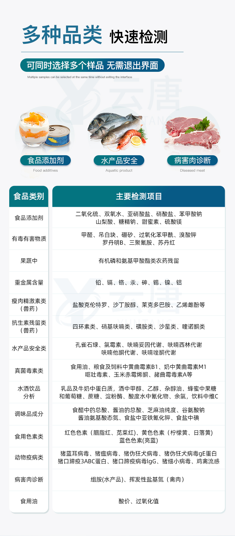 抗生素殘留 | 四環素類、硝基呋喃類、磺胺類、β-興奮劑類、沙星類、磺胺類、喹諾酮類,甲砜霉素,氟苯尼考,金剛烷胺、替米考星、慶大霉素、林可霉素、鏈霉素、恩諾沙星、環丙沙星、頭孢啦啶、青霉素、阿莫西林等 |