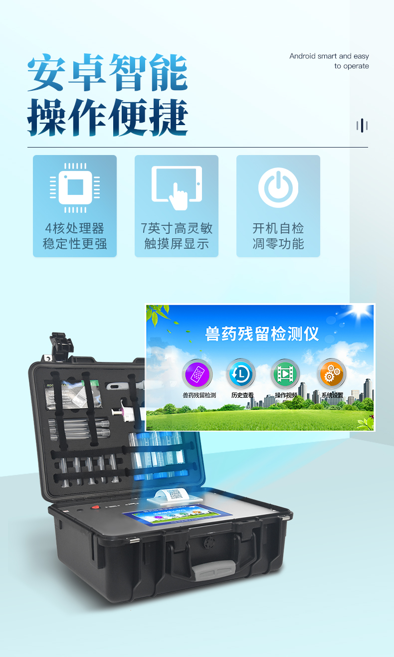 3.☆檢測項目:可檢測農(nóng)藥殘留、食品添加劑、色素、可現(xiàn)場快速檢測農(nóng)藥殘留、鹽酸克倫特羅、沙丁胺醇、萊克多巴胺、四環(huán)素類、硝基呋喃類、磺胺類、沙星類、氯霉素、孔雀石綠磺胺類,并且可以連接食品安全監(jiān)控系統(tǒng)。