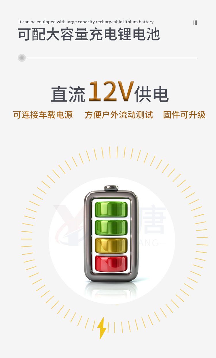 2、直流12V供電,可連接車載電源,可配6ah大容量充電鋰電池,方便戶外流動測試。