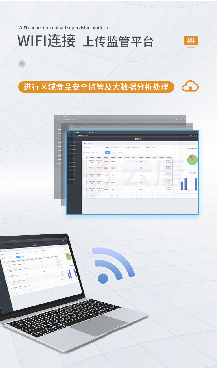 8、儀器帶有監管平臺。數據可局域網和互聯網數據上傳,檢測結果直接傳至食品安全監管平臺。進行區域食品安全監管及大數據分析處理,檢測區域食品安全長短期動態,達到食品安全問題預估、預警。