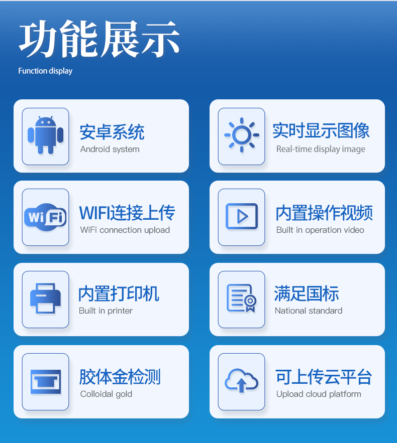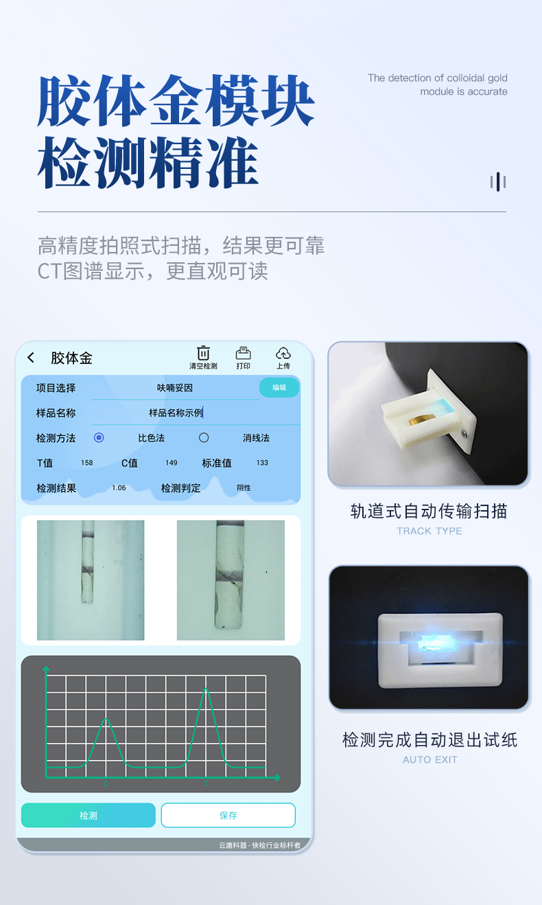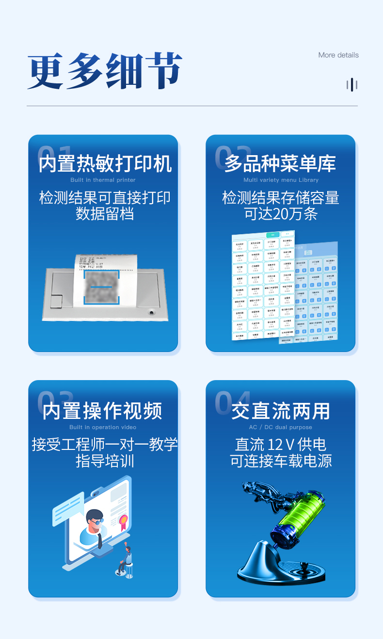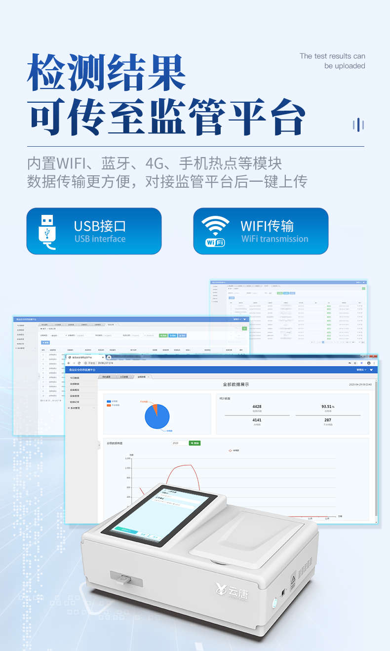 | 儀器采用10.1英寸液晶觸摸屏顯,搭配運行安卓智能操作系統,主控芯片采用ARM Cortex-A7,RK3288/4核處理器,主頻1.88Ghz,運轉速度更快速,性能更強。 | 儀器功能包括:膠體金檢測模塊、數字化管理模塊、無線通訊模塊等,可以滿足同一軟件下實現所有檢測項目的檢測,并在同一窗口展示檢測結果。 | 一體化便攜式快檢設備,采用交直流兩用供電方式,可連接車載電源,配備6ah大容量充電鋰電池,可以滿足現場及流動檢測使用的需求。儀器尺寸:43×35×20cm, 主機凈重:5.1kg | 系統自帶數據集成模塊,設備首頁自動統計檢測數據包含:周檢測數據、月檢測數據,全部檢測總數量,均包含檢測總數,合格數,不合格數,以及相關柱形分析圖,對各項檢測數據清晰掌握,無需電腦查詢,更加快捷直觀。 | 儀器具有任務預設模塊,可在樣品送檢前提前預設樣品名稱、檢測指標、送檢單位等信息,樣品送檢時一鍵調取保存信息,檢測更加方便快捷。 | 膠體金檢測模塊: 直插式自動掃描方式,可實時顯示金標卡實時圖像,系統自動分析并呈現出CT曲線圖,CT線自動識別,無需手動調整,完成檢測后自動退出檢測卡。 結果判定線可修改,對照值標定值可保存,斷電不丟失數據。 兼容市場上其他膠體金卡,使用耗材不受限制,極大增強用戶使用體驗。 | 儀器檢測系統擁有龐大數據庫,并且構建了完善的檢索、修訂功能。食品庫涵蓋多種樣品名稱,可按需添加或刪除、編輯樣品名稱;產品數據庫以及歷史檢測記錄支持一鍵檢索功能。 | 系統打印自定義化,打印格式多樣化,產品合格證(國家標準要求),二維碼,抽樣信息、檢測信息,受檢信息、復核信息、抽樣日期、檢測日期等信息結果,可按需求自行設置打印內容。 | A4紙版本報告打印功能(可選配):設備擁有兩種結果展示方式,可以自動生成A4打印模板和小票打印模板兩種樣式,可通過WiFi及網線等方式鏈接外置打印機可進行打印 | 儀器具有 wifi 聯網上傳、RJ45網線連接功能,可以快速上傳數據。同步對接監管平臺,數據可局域網和互聯網數據上傳,檢測結果直接傳至食品安全監管平臺。進行區域食品安全監管及大數據分析處理與數據統計,檢測區域食品安全長短期動態,達到食品安全問題預估、預警。 | 設備支持U盤存儲,標準USB接口,免驅動安裝。檢測結果存儲容量20萬條以上,可生成Excel表格,進行一鍵拷貝,并具有登錄保護功能,可設置用戶名及密碼,規范不同人員操作權限,防止非工作人員操作,并且可以進行重新校準、鎖定、恢復出廠設置功能。儀器固件可升級,后期檢測項目可擴充。 | 儀器具備遠程升級功能,可定向分客戶分儀器更新,開機后自動更新,并可持續性免費更新系統版本,無需像傳統產品返廠更新,節省時間及人力成本并避免了物流運輸返廠升級導致設備損壞的潛在風險。 |