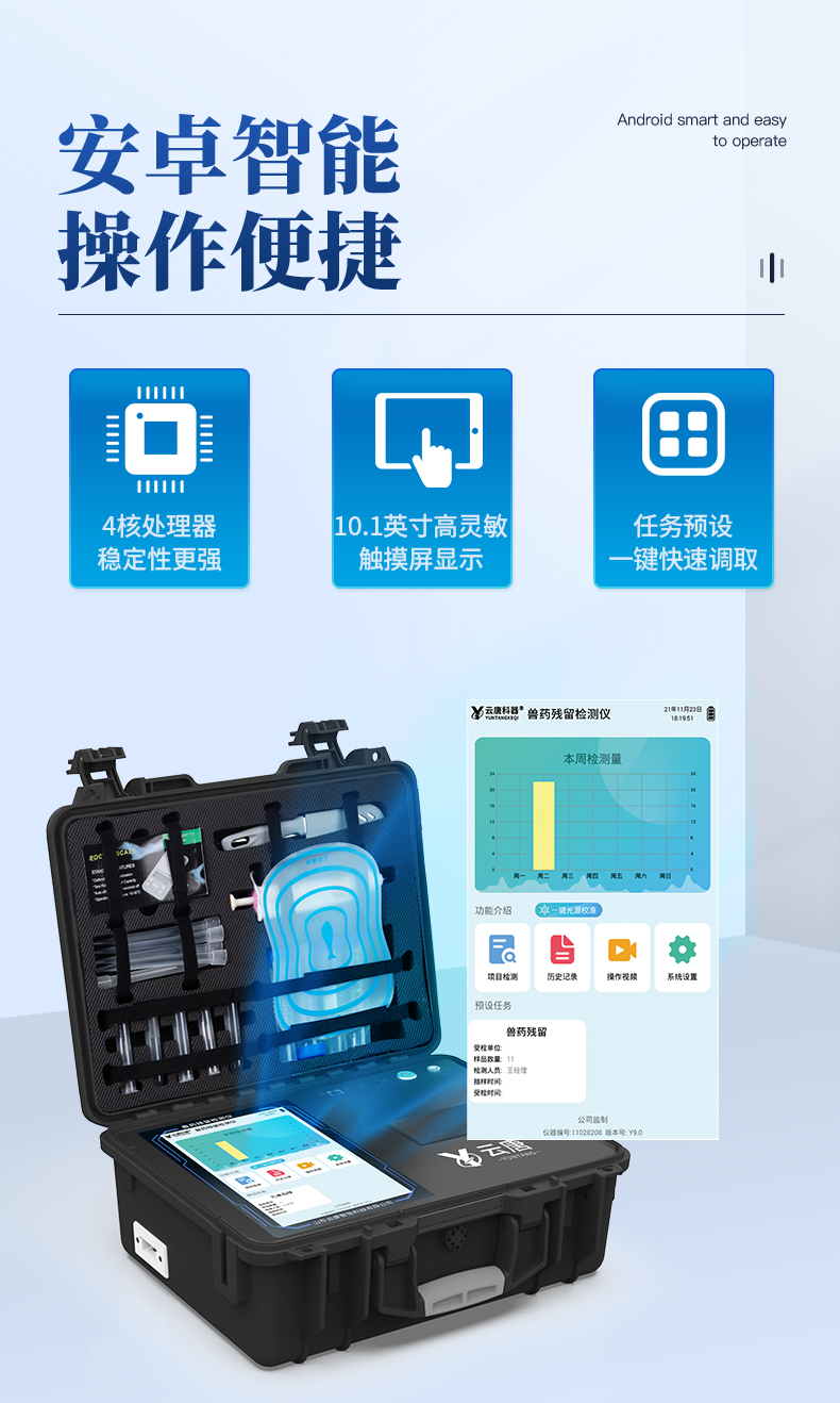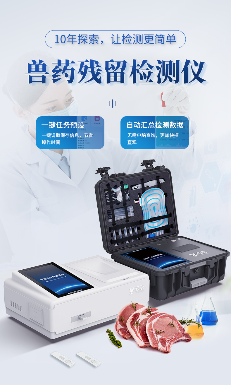 山東云唐智能科技有限公司生產的高智能獸藥殘留檢測儀可快速檢測瘦肉精激素類食品安全項目,包含鹽酸克倫特羅、沙丁胺醇、萊克多巴胺、己烯雌酚,獸藥殘留、抗生素類殘留、真菌毒素類殘留、動物疫病類等檢測