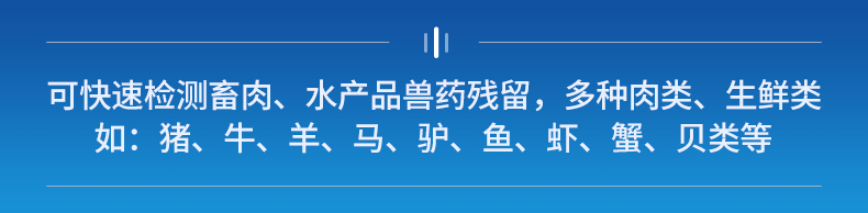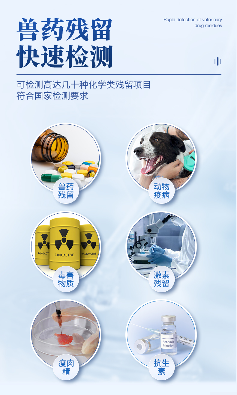 | 瘦肉精激素:鹽酸克倫特羅、沙丁胺醇、萊克多巴胺、己烯雌酚等 | 抗生素殘留:四環素類、硝基呋喃類、磺胺類、β-興奮劑類、沙星類、磺胺類、喹諾酮類,甲砜霉素,氟苯尼考,金剛烷胺、替米考星、慶大霉素、林可霉素、鏈霉素、恩諾沙星、環丙沙星、頭孢啦啶、青霉素、阿莫西林等 | 水產品安全類:孔雀石綠、氯霉素、呋喃妥因、呋喃西林、呋喃它酮、呋喃唑酮等 | 蛋類藥物殘留:氯霉素,四環素,磺胺類,喹諾酮類,呋喃西林,呋喃它酮,呋喃妥因,呋喃唑酮,氟苯尼考,阿莫西林、頭孢氨芐、紅霉素、鏈霉素等 | 動物疫病類:禽流感、新城疫、牛羊口蹄疫、牛羊結核病、牛羊包蟲、牛羊布病、小反芻獸、豬藍耳病毒、豬瘟病毒、豬偽狂犬病毒、豬細小、豬圓環、犬細小病毒、犬瘟熱病毒、犬狂犬病毒等 | 真菌毒素殘留:食用油、糧食及飼料中黃曲霉毒素B1、黃曲霉毒素總量,奶中黃曲霉毒素M1、嘔吐毒素、玉米赤霉烯酮、赭曲霉毒素A、T2毒素、伏馬毒素等 |