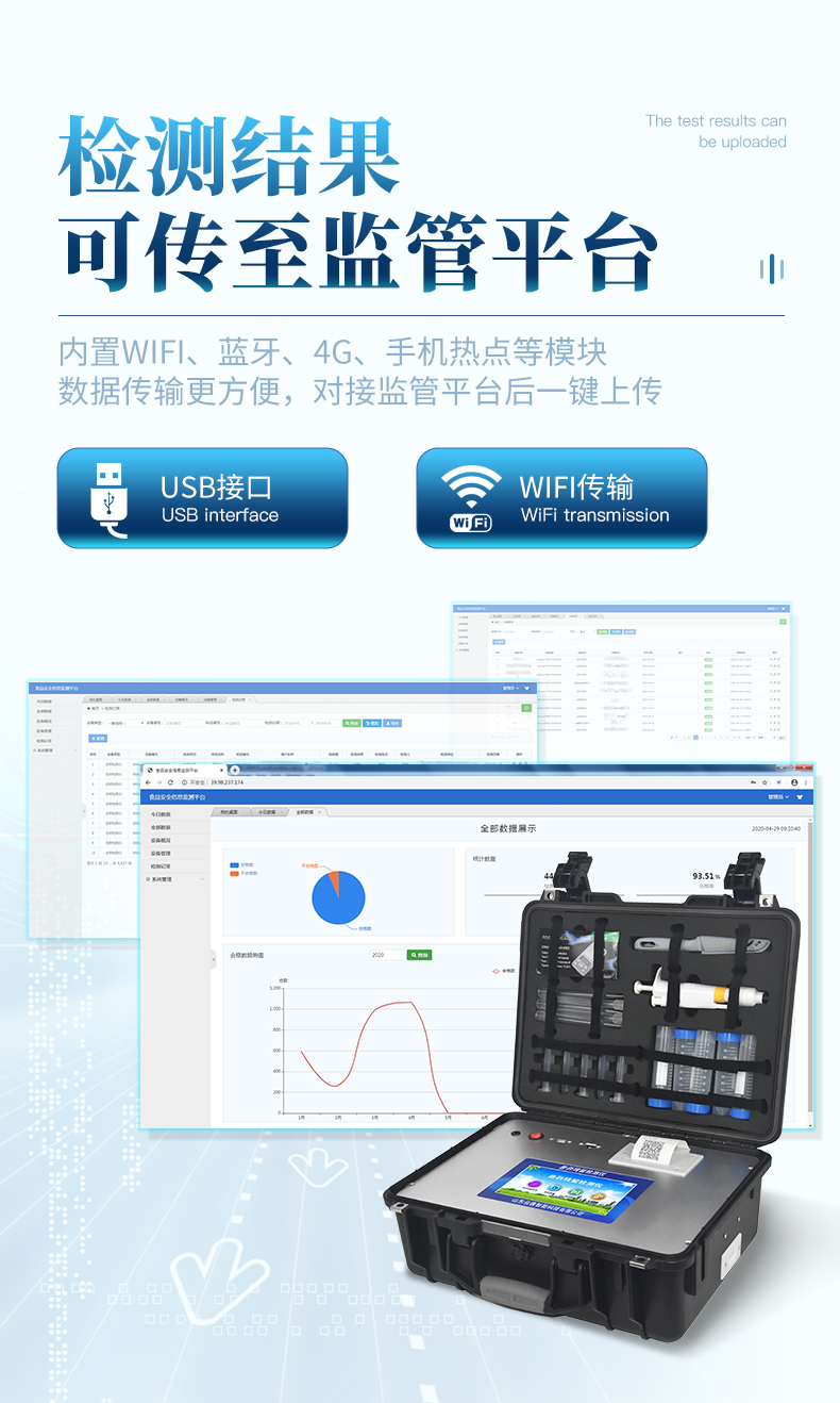 4、儀器帶有監管平臺,數據可局域網和互聯網數據上傳,檢測結果直接傳至食品安全監管平臺。進行區域食品安全監管及大數據分析處理與數據統計,檢測區域食品安全長短期動態,達到食品安全問題預估、預警