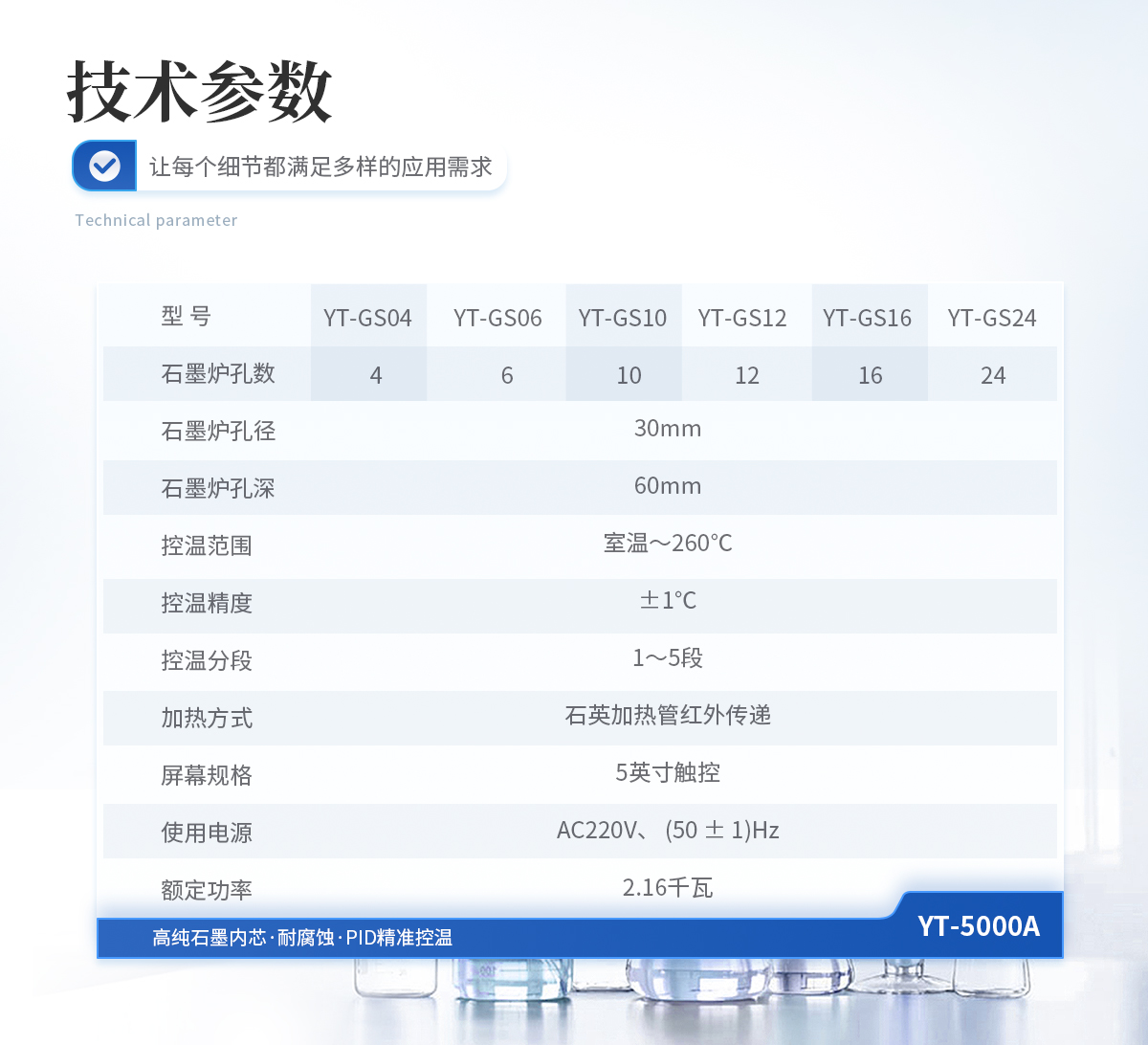 石墨爐孔:孔徑30mm,孔深60mm,孔數(shù)4×4 控溫范圍:室溫~260℃ 控溫精度:±1℃ 控溫分段:1~5段 加熱方式:石英加熱管紅外傳遞 屏幕規(guī)格:5寸觸控 主機(jī)外型尺寸:寬477mm×深460mm×高168mm 使用電源:AC220V、 (50 ± 1)Hz 額定功率:2.16千瓦