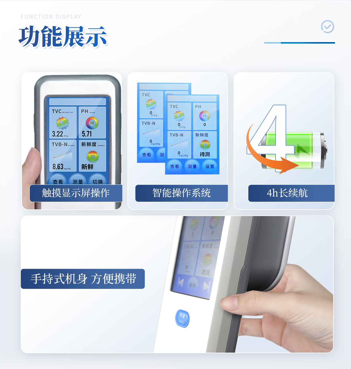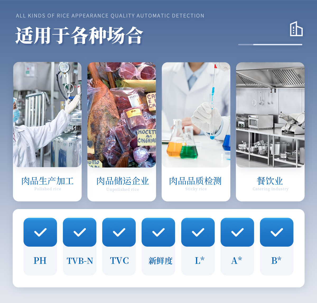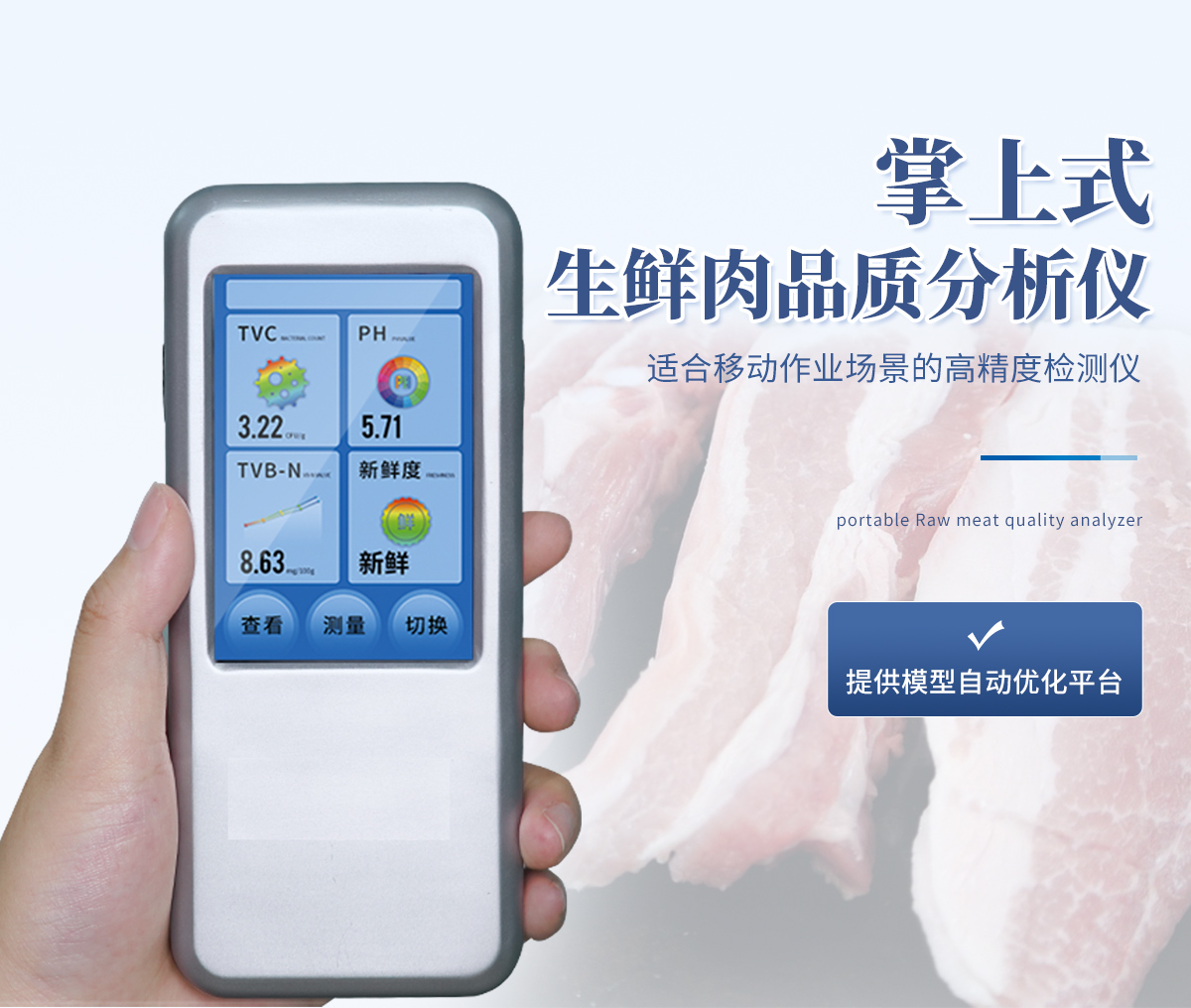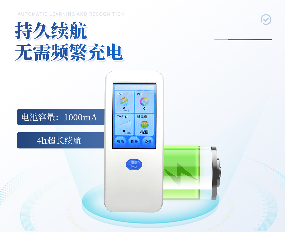 聯(lián)合中國(guó)農(nóng)業(yè)大學(xué)彭彥昆教授團(tuán)隊(duì)研發(fā)的掌上式生鮮肉新鮮度分析儀,可用于檢測(cè)生鮮肉的TVC、pH、TVB-N、新鮮度、L*、A*、B*等評(píng)價(jià)指標(biāo)。Palmarter具有體積小、便 于攜帶、性價(jià)比高等特點(diǎn),其應(yīng)用場(chǎng)景包括但不限于肉儲(chǔ)運(yùn)企業(yè)、肉品品質(zhì)監(jiān)管部門、飯店、超市、菜場(chǎng)、家庭等。